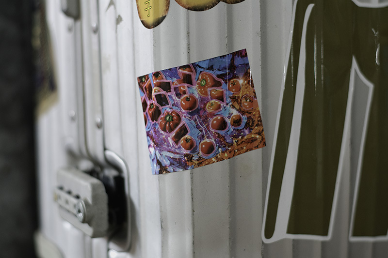 “Pink and Blue” features a tomato and green pepper glowing in pink light.